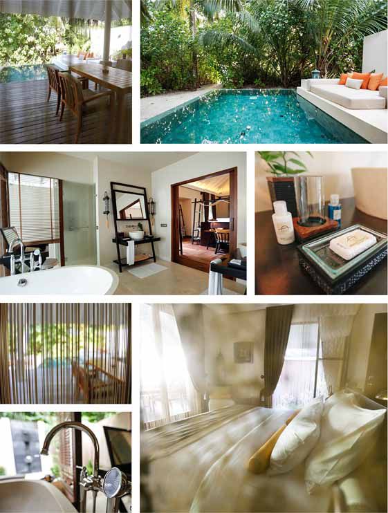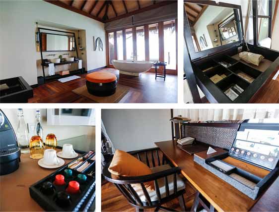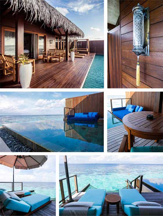 水上别墅位于清澈的印度洋水域,位于海上的海洋别墅,窗外便是印度洋的美景,设有卧室、浴室、阳台、私人游泳池和一张观海吊床,让宾客在宁谧的海上休息和享受日光浴,悠然自得。室内设施包括:日光浴躺椅、日光浴沙发、室外客厅、平面液晶电视、CD/DVD播放器、iPod连接、Wi-Fi无线上网、书桌、国际直拨无线电话、咖啡机、精选茶叶、保险箱、房内私人酒吧/酒窖、小型保险箱等等。别墅的管家会随时提供服务或者帮助,还有24小时别墅用餐和送餐服务。