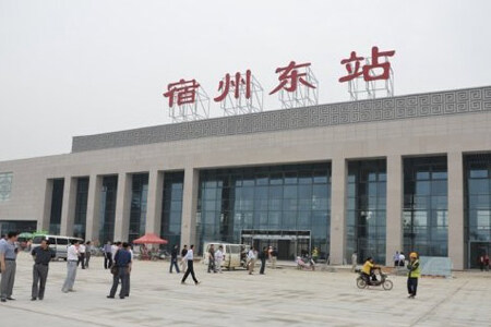 宿州东站,占地200余亩,京沪高铁宿州段长65.76公里,由北向南贯穿我市,途经埇桥区杨庄乡、栏杆镇、支河乡、永安镇、桃沟乡、蒿沟乡、大店镇7个乡镇、36个村庄。宿州东站距城区直线距离23公里,现已修好市区与铁路接驳公路,开通了接驳线公交线路。京沪高铁宿州东站至城区接驳线客车实施方案已制定,拟投放10辆19座中型中级客车(先期投放6辆),每天5:30至21:30双向循环发车,平均1小时一班。