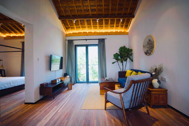 原舍•平湖位于白鹭湖畔,竹山掩映,前湖后林,清雅悠然,门前还有平静的白鹭湖景,真的能体会到诗与远方的唯美意境。