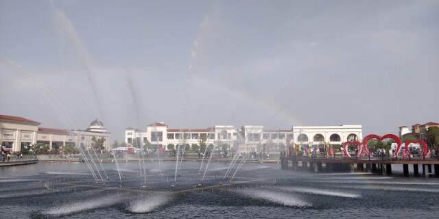 音乐喷泉广场是汤山百联奥特莱斯的中心广场,摩天轮就临靠广场边。晚上6点后,会有喷泉灯光秀。