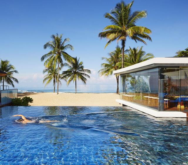 独栋的海滨别墅,酒店的私人无边泳池面朝 Andaman 大海,周围棕榈树环绕,时尚的设计感让你坐拥无敌海景,每栋别墅都有超大私人泳池,更贴心的是旁边还有一个有坐椅的海边调酒吧(Beach Ba人),看海、喝酒,置身其中还能完全的放松身心。