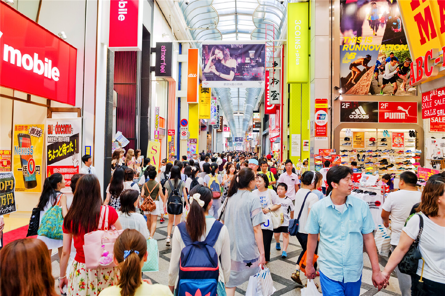 なんばウォーク(Namba Walk)东西长715米,是连接地铁难波站和地铁日本桥站的一条笔直的购物街,被分为3块区域。这条地下商店街的小店铺鳞次节比,有很多的年轻人在这里售卖他们制作的手工艺品。