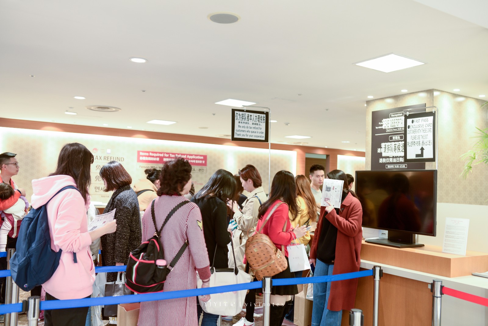 南馆4楼设有退税专区,无论是在南馆还是北馆,买完商品后,去退税专区排队,有专人检查护照、刷卡用的卡以及购物小票,确定合规后,再帮你包装、退税。