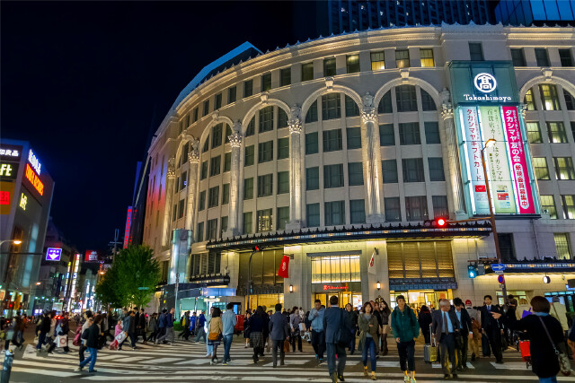 日本大型连锁百货商场高岛屋的难波分店,1楼的化妆品专区和3楼到5楼的服装专区,品牌齐全、款式流行前卫,格外受顾客的青睐。