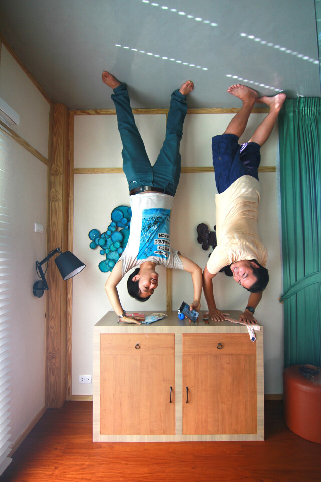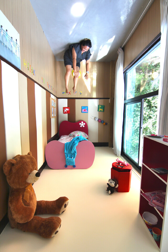 在这里,你可以在房屋内的各个家具设施旁,摆出各种奇葩姿势拍照,像天花板走路,从床上弹飞等等都可以,拍照后你的朋友圈果断的都是惊奇的评论。不会拍的话,可以让工作人员指导。