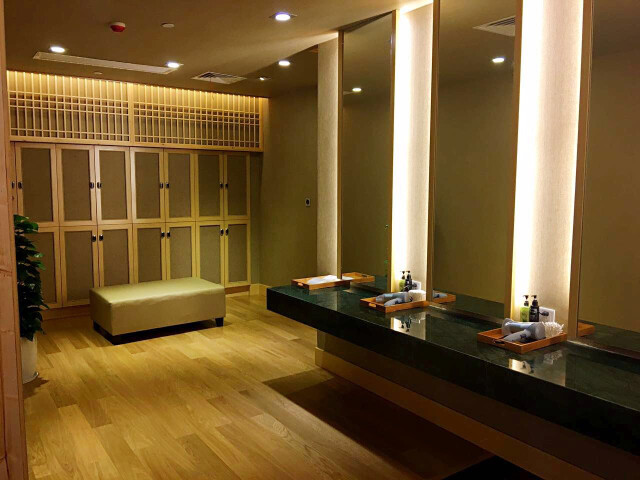 汤池有着日式的奢华,通往汤池的过道上便能看到不少的日式浮世绘挂画,亮堂整洁的更衣室显得分外大气,原木的装修风格也是十分的优雅。