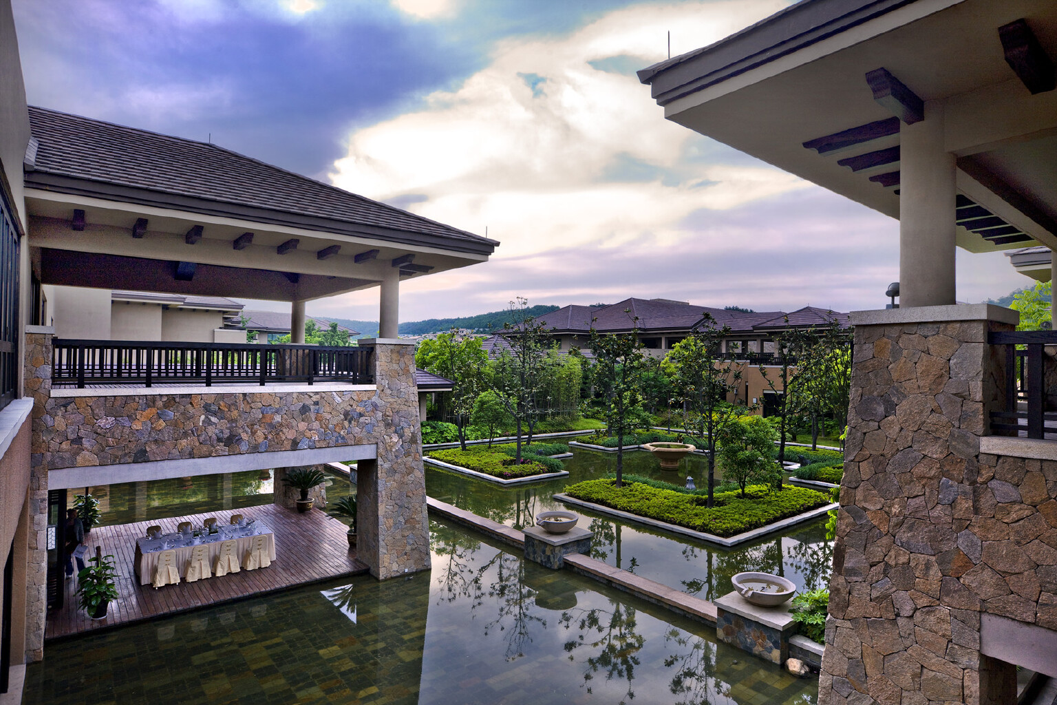良渚文化村可是依山傍水,青山隐隐,水川潺潺,这样的风光景色下良渚君澜更是显得沉稳宁静。周边的古韵建筑加之本身的风雅景观,铺陈的是一副世外的长卷。