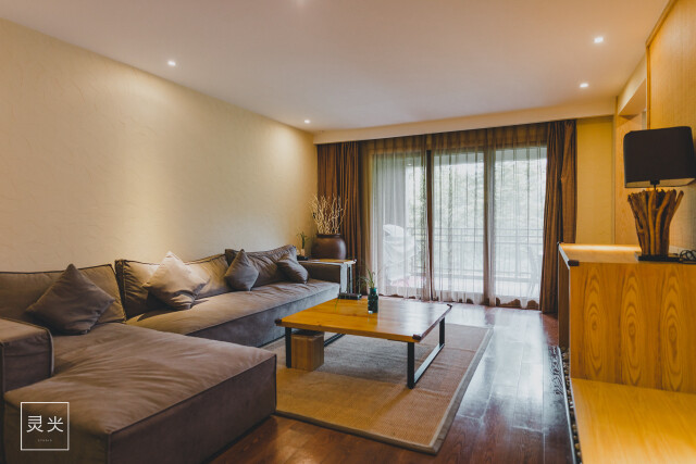 这里的别墅有着日系的简约风格,整体色调偏暗,全落地玻璃窗让整个莫干山铺展在眼前。