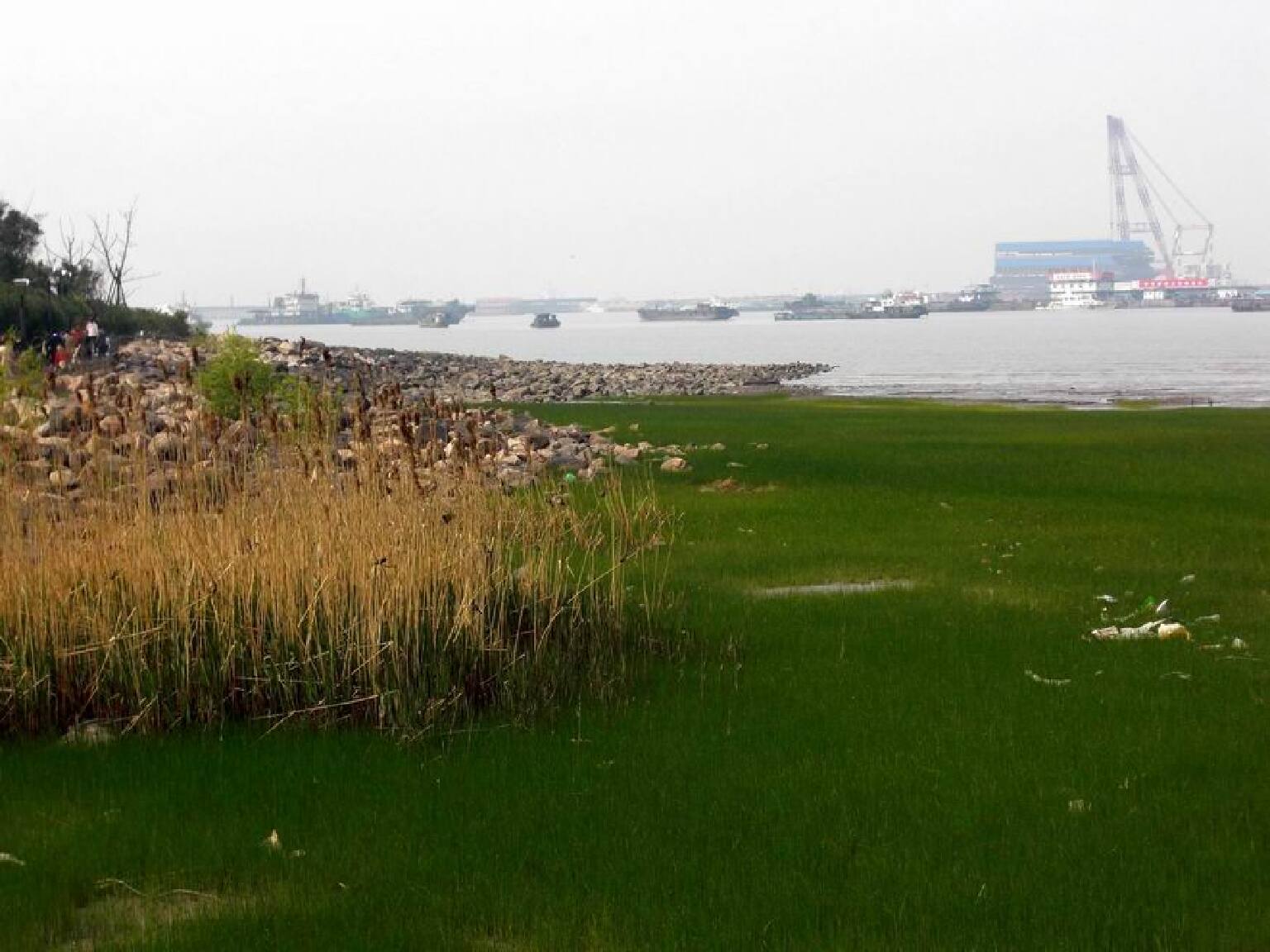 这里原本是钢渣废墟,利用原有的长江滩涂湿地,建成了如今的湿地公园。沿江岸线长达2公里,在亲水木栈道眺望对岸的浦东新区,天气晴好时,还能看到一江之隔的长兴岛。