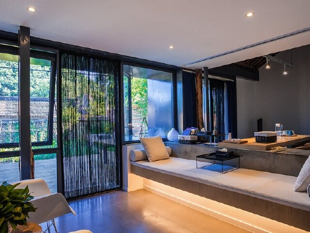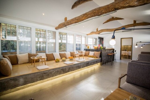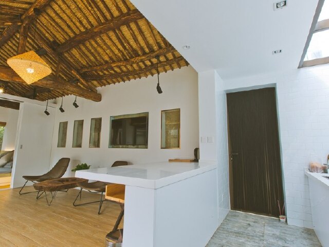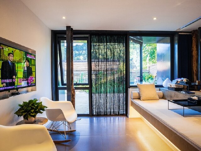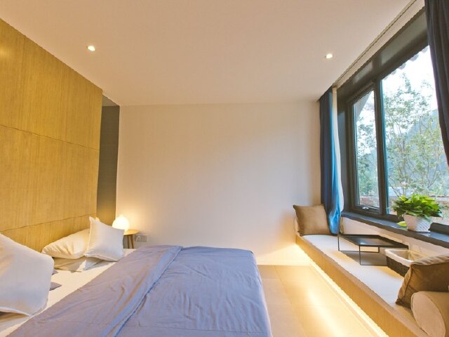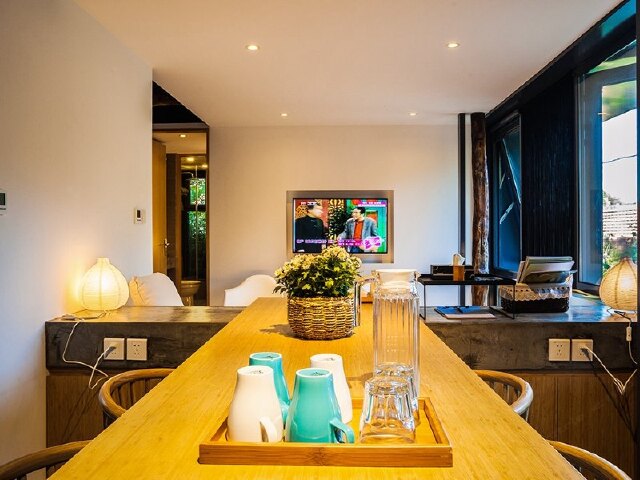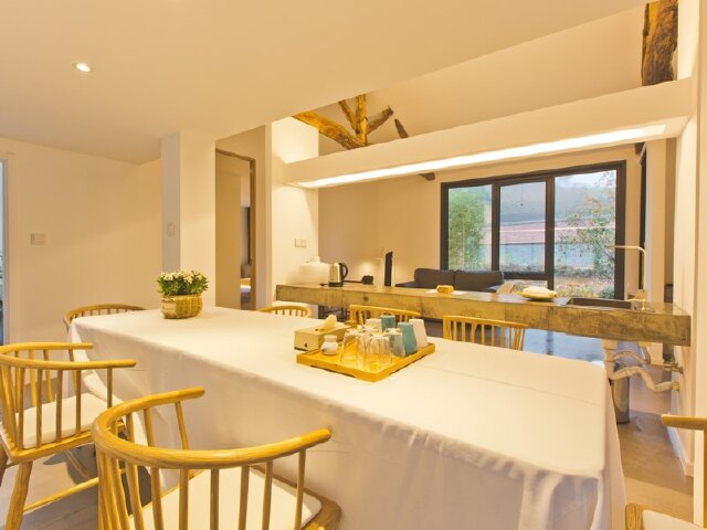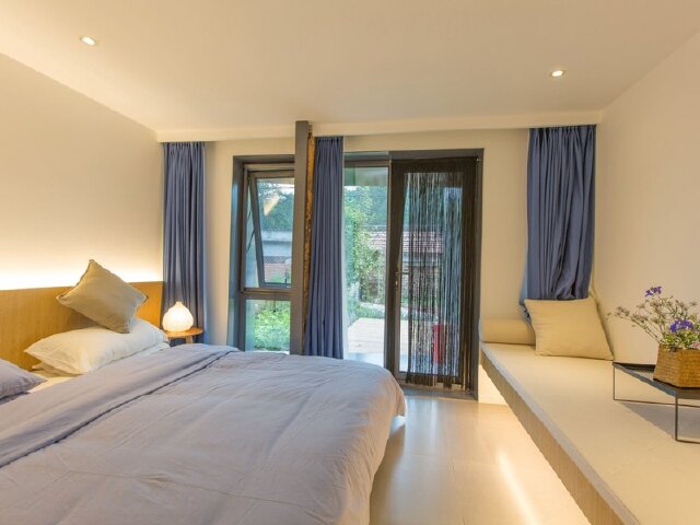 而室内宽敞明亮的客厅、现代典雅的吧台、舒适简约的客房,又与屋外的花草青竹遥相呼应,交织成一片定格的时光。