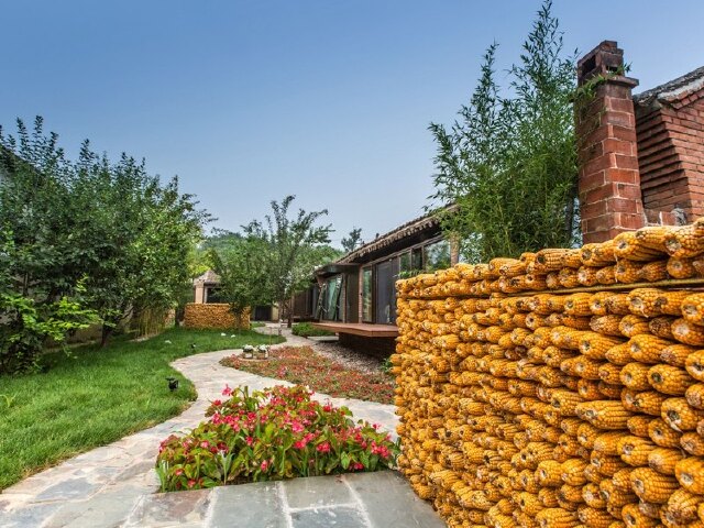 低矮的土色围墙,黑色的门上写着“山楂小院”(当然,你也可能注意到门上红色的“隐居乡里”四个字),金色的玉米堆叠在一旁。此情此景,从北京市区钢筋水泥的现代繁华忽的就切换成田间地头的田园牧歌。
