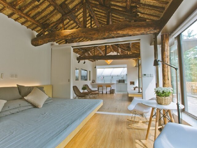 虽然窗外就是乡间田野,但巨大的落地窗内,还是那个现代化的北京,让人既能感受到新鲜的乡村气息,又有都市生活的舒适惬意。