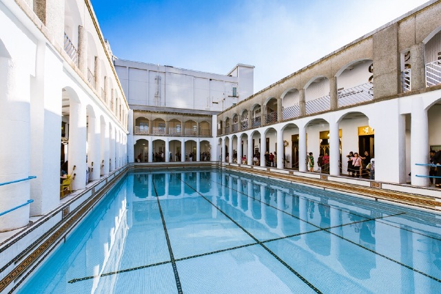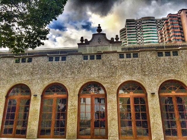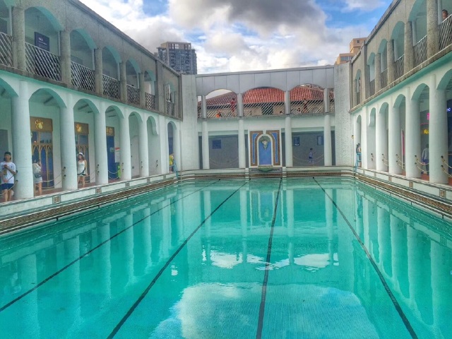 据说这里是上海唯一还保留着英制尺寸的游泳池,本来是海军俱乐部露天泳池,两旁的西班牙风格建筑,拱门和泳池相呼应,让人有些恍惚身在何处。