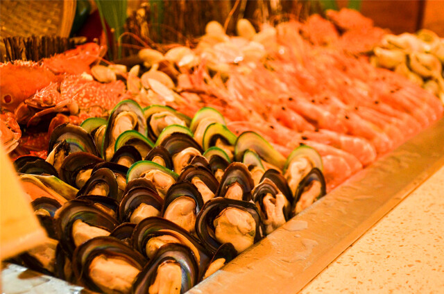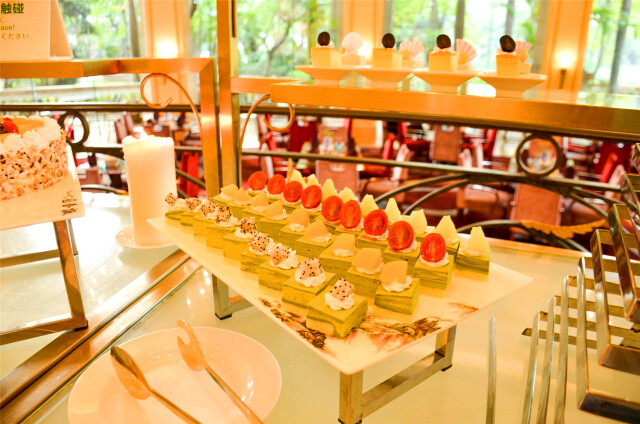 落地玻璃代替了墙面,嫩黄的色彩下,不用灯光,视线依旧明亮,而窗外的园林景观也开始散发着娇艳欲滴的色彩。装饰精美的甜点,营养丰富的美食,这里的西式、中式、日式和东南亚特色菜肴,在现场钢琴演奏下,更加美味了起来。