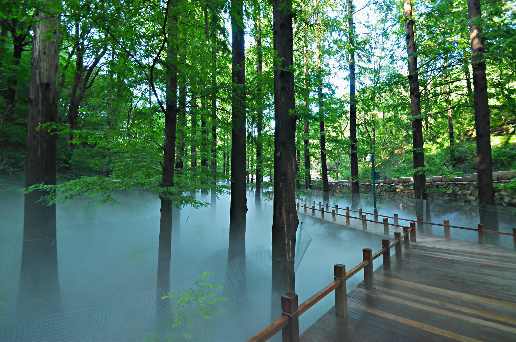 架在溪流上的全实木栈道是沟内的一道靓丽风景,沿着蜿蜒曲折的栈道,一路走进林荫深处,便能看到一片笔直耸入蓝天的水杉林,与人工雾气完美契合,恍若仙境。