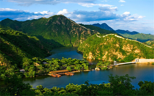 山明水秀的灏明湖中,长城如巨龙般盘旋在起伏的山势之上,因周边开满黄花,所以叫黄花城水长城。因修建水库导致水位上升,黄花城水长城有三段入水,形成巨龙戏水的奇观,让人叹为观止。