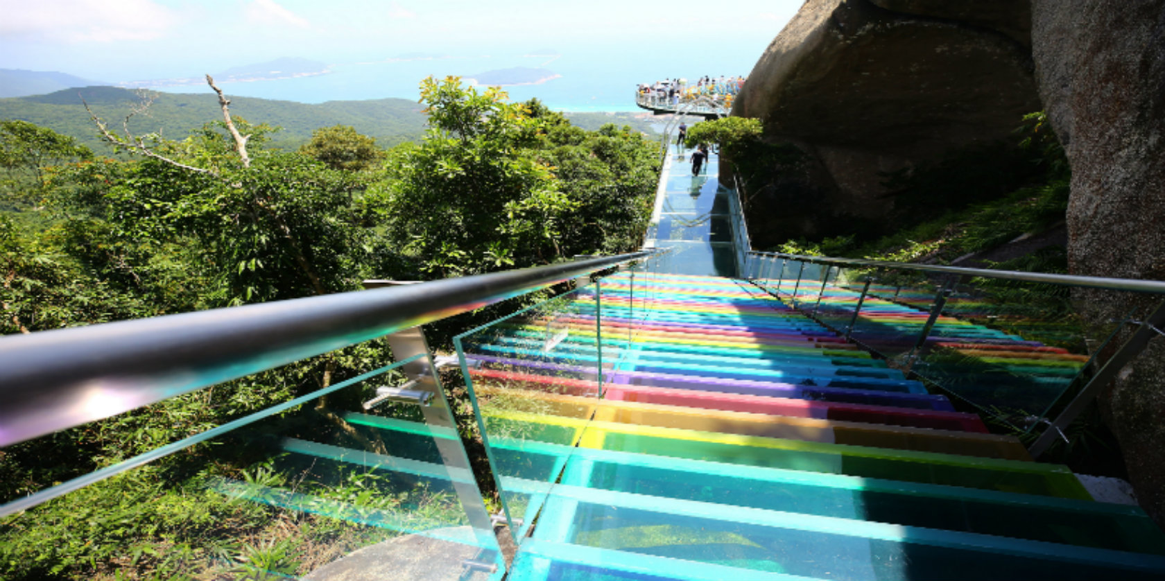 七彩栈道环翠屏峰倚峭而建,360度观赏东湖港风景,全长2000米,由800米体验区和1200米挑战区组成,七彩玻璃位于挑战区内,犹如一道彩虹桥通向云端。
