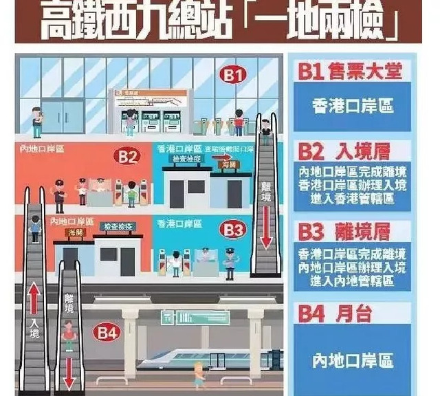 从B1售票层购票入闸后,前往B3离境层办理香港出境程序和内地入境程序,然后就可以在B4月台乘车前往内地。