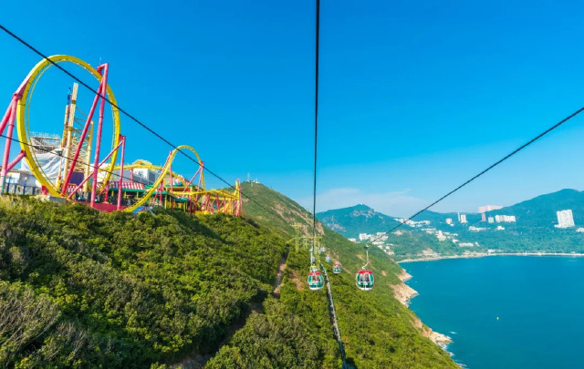 设计上,将整个公园切分成山上山下两个不同的地段,彼此之间是通过登山电梯、海洋列车还有架空缆车来连接的,搭乘过程中就能欣赏到深水湾、浅水湾的海景。