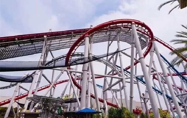 a.红蓝过山车 最刺激的项目,红色过山车是坐在车子上的,轨道不翻转,会有明显的爬升和快速的下降。蓝色过山车是类似于悬挂的,轨道有几处翻转的地方,所以更加刺激。