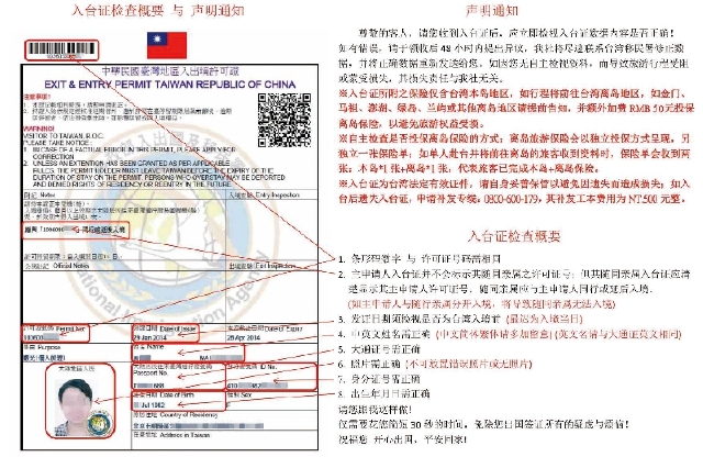 3. 入台证《中华民国台湾地区入出境许可证》