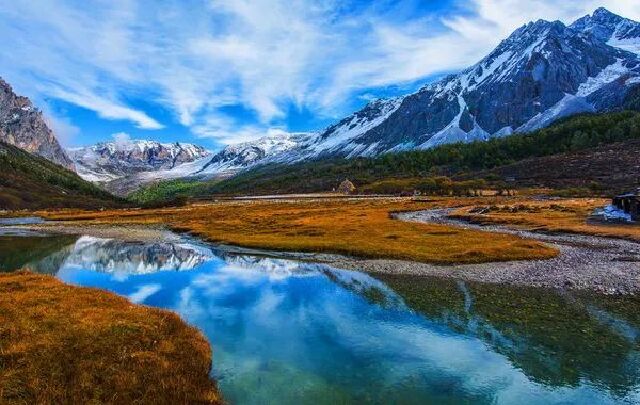 被藏族传说中三座神山包围的稻城亚丁,一下雪就美得惊心动魄。一场雪之后,稻城亚丁就成为了“纯净”的代言人。树木和山川全部都是银装素裹,整个天地一片白茫茫,只剩下冰清玉洁的瀑布和湖泊点缀其间。冰雪初融之时,远处雪白晶莹的雪山、金黄色的草甸和五彩缤纷的树林颜色搭配的刚刚号,牦牛在远处慵懒的沐浴着阳光,在4000米的海拔高度上,一幅山水淡墨话触手可及,恍惚间,天堂就该如此!