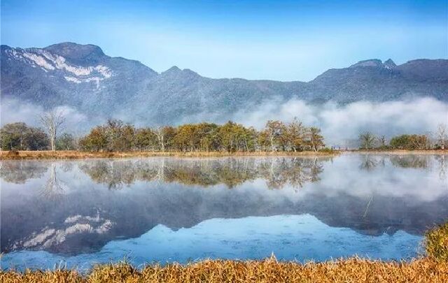 不识庐山真面目,可能是在庐山之中,也可能是被庐山的雪迷了心。由于靠近鄱阳湖,所以庐山的水汽要比一般的山来的重,因此除了雾凇以外,还会形成雨凇的奇观。起雾之时,水汽慢慢附着在树枝和树叶上,漫山遍野都是一片雪白;如果是在阴雨天气,晶体呈现出一种无色的透明状,在阳光之下熠熠发光,这就是雨凇了。庐山的雪是典型的“南雪”,虽没有北方的利落爽朗,但是独具一种眼角眉梢之间的风情。