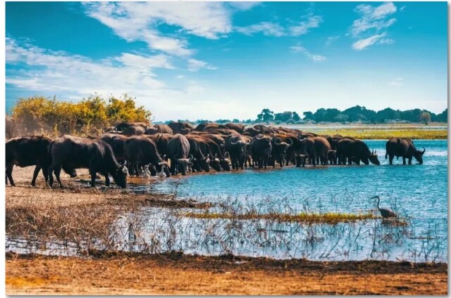 乔贝国家公园一路沿河,在一年的大部分时间里,乔贝河决堤,河水冲破堤岸,流入周围的泛滥平原,形成了一片浅滩,成群的水牛和河马惬意栖息于此。看着那些庞大又可爱的大象在水中嬉戏玩耍,心情无比愉悦。