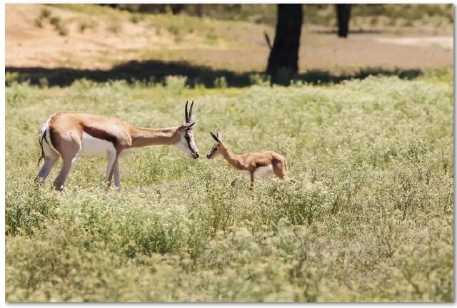 喀拉哈里沙漠的整个西部以长长的沙丘链为特色,每一个沙丘同其邻丘都由一个宽而平行的凹坑分隔开来,凹坑被当地人称为“街”或“小路”,便于人行进。雨季植物繁盛,地面覆盖着草场,羚羊和可爱的狐獴让人目不转睛。