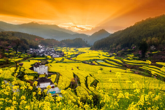 婺源的油菜花每年3月开始争相开放,一波又一波,层层叠叠的万亩油菜花梯田蜿蜒于群山之中,漫山遍野的耀眼金色把粉墙黛瓦的古房屋点缀得恰到好处。