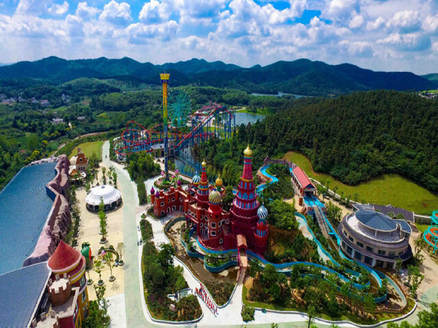 乐园分为游乐区、生态休闲区、商务区、高尔夫球场、酒店别墅区。儿童主题馆区中有安徒生童话馆,分为4个场景,再现了“灰姑娘城堡”、“天鹅湖”、“迷宫”、“许愿池”等场景,恐龙谷内100多个恐龙,配以声光电等设备,还原真实场景。