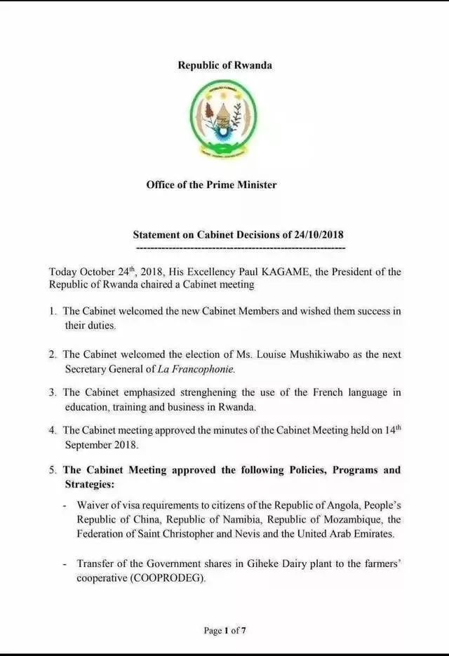 就在10月25日,非洲中部国家卢旺达内阁会议通过了对中国、安哥拉、纳米比亚等6个国家的免签政策,发布了官方文件: