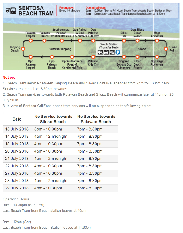 发车频率10分钟,免费,双向发车,路线分别为海滩巴士换乘站至丹戎海滩、海滩巴士换乘站至西乐索海滩