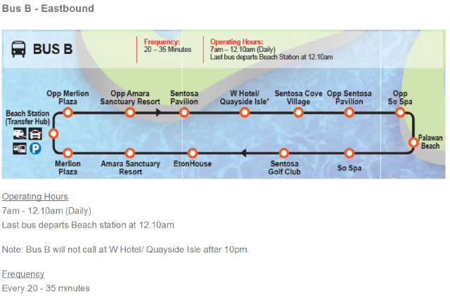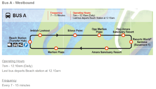 Bus A:运行时间7:00-00:10,发车频率7-15分钟,环线路线为海滩巴士换乘站至圣淘沙名胜世界