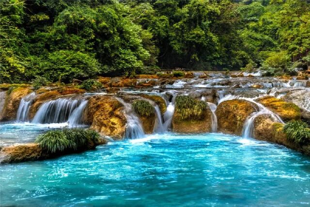 初见小七孔景区,蓝天碧水,湍流涌动,瀑布横飞,古树与河流相互映衬,一副“小九寨沟”的模样。