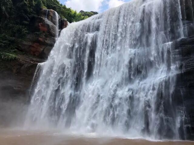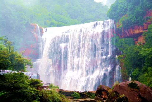 银白色瀑布飞泻之下,激起层层浪花!透过朦胧水雾,赤色崖壁在瀑布冲洗中若隐若现,宛若朱砂。
