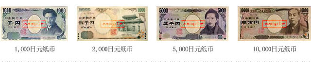 纸币有1000日元,2000日元,5000日元,10000日元的面值,其中2000日元并不多见,在许多自动贩卖机上也没法使用。