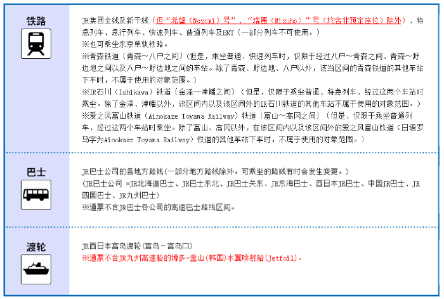 ※1日本铁路通票不含新干线“希望(Nozomi)”号和“瑞穗(Mizuho)”号的非预定座位和预定座位。