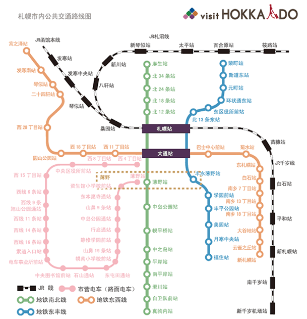 北海道里只有札幌有地铁,现有“南北线、东西线、东丰线”3条线路,分别在市中心的“札幌站”、“大通站”交会。地铁和市内巴士之间的转乘有折扣﹔地铁本身也有各种优惠票。因此,札幌市内观光的话,搭乘地铁确实很方便。