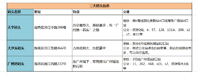珠江夜游上船的码头比较多,其中较为出名的是天字码头、大沙头码头和广州塔码头,可根据自己的行程自由安排。