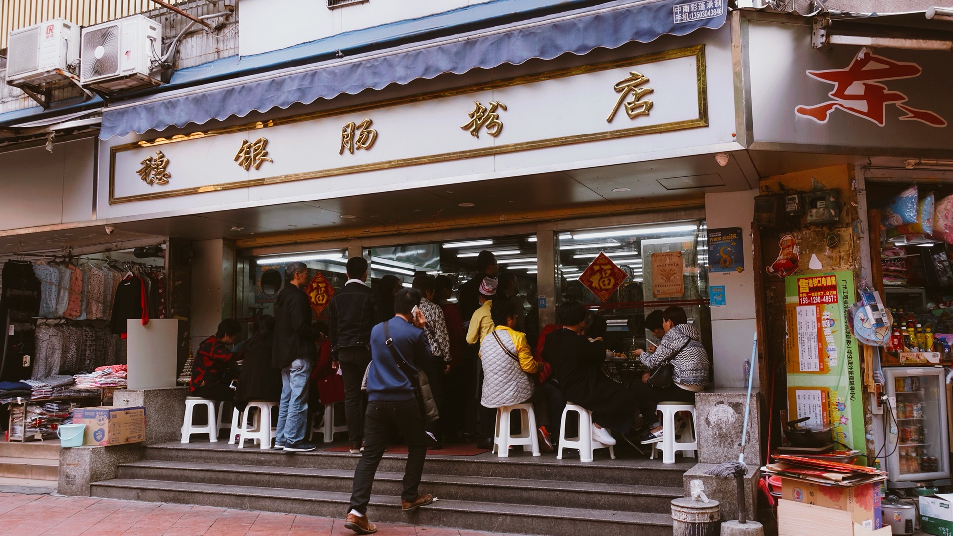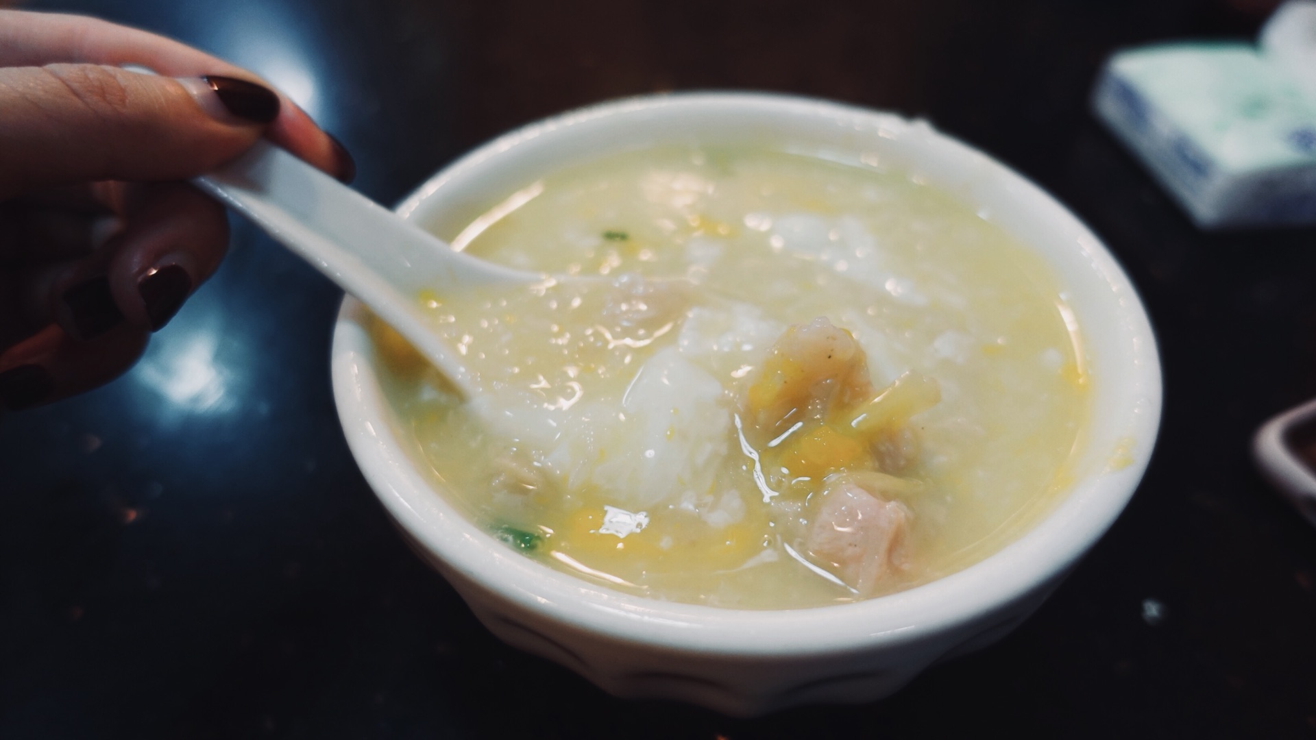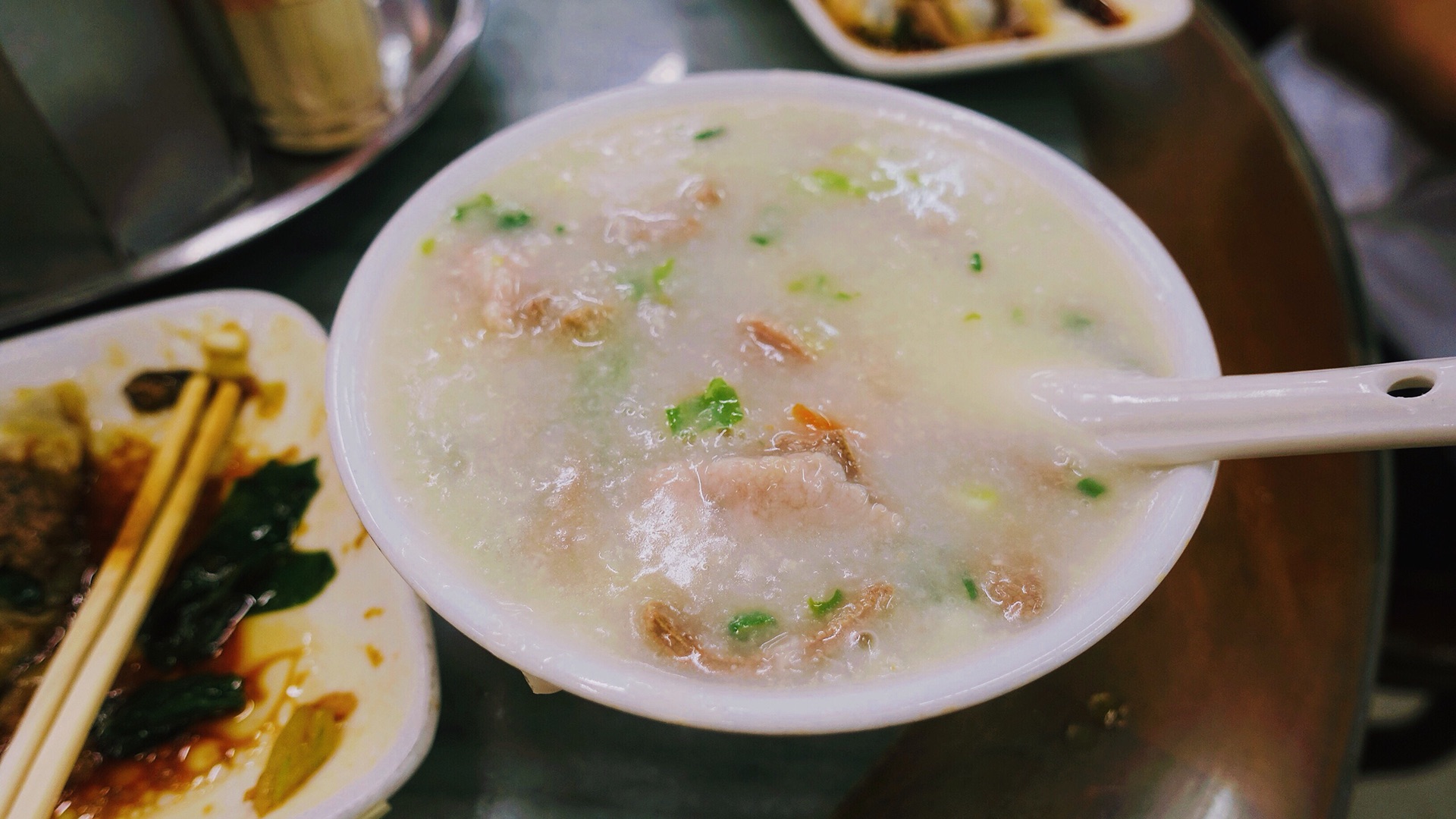 喝粥喝的正兴起的时候,被挂的高高的老电视机被老板娘调到了一个当地的选秀唱歌节目,自带复古气质的粤语歌声吸引了一旁喝牛三星汤的大叔,蹭蹭蹭走到电视机底下看,搞得我也没忍住瞧了两眼,想象一下,我、老板娘、大叔三个人在黑暗的环境下,抬着头,傻笑着看电视的模样,和 香港 老电影一家三口盯着电视里面看彩票公布一样,莫名的美好,哈哈哈哈哈哈哈哈!