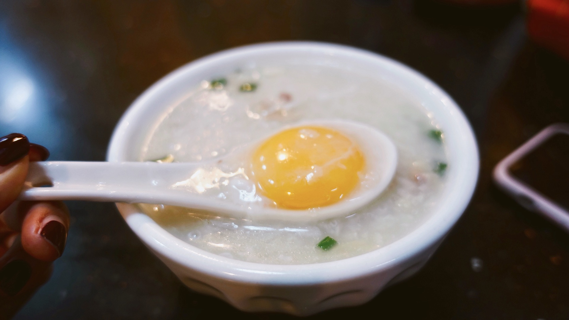 看网友们的吃法,可以加颗蛋,2块钱。上桌满满的一碗鸡粥感觉快要溢了出来,鸡香味四溢,用勺子捣了几下,发现里面鸡肉块真的很多,一勺入口,鲜到爆炸!我又要说了,这辈子喝过最好喝的粥大概就是这碗了吧!弥补了没喝到 潮汕 砂锅粥的遗憾~