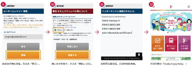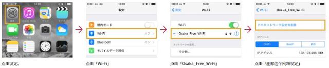 大阪府特别注明:OsakaFree Wi-Fi仅限取得日本技术标准符合证明的终端使用,如使用由日本以外国家带入、未取得该证明等的终端,则会违反电波法。(Apple公司的iPhone、iPad等可以使用。)