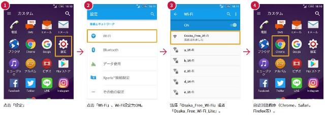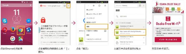 如果是用最新Chrome APP 开启Osaka Free Wi-Fi,则相同功能的APP将无法显示Osaka_Free_Wi-Fi首页(会被阻挡)。依照以下次序操作,就可以使用。