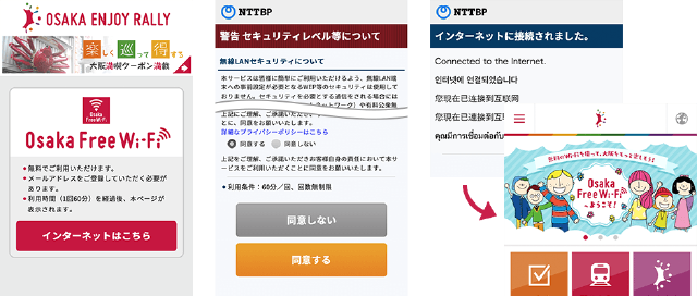 Osaka Free Wi-Fi,跨区域使用的时候,每次都会显示Wi-Fi首页。(一部分车站等场所能继续使用。)