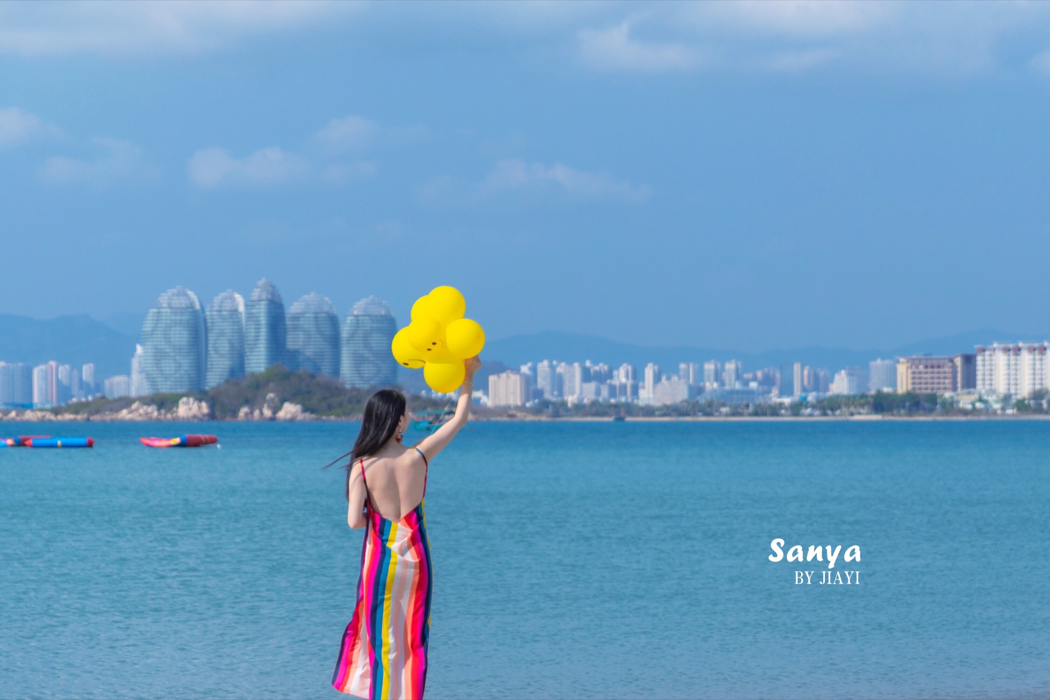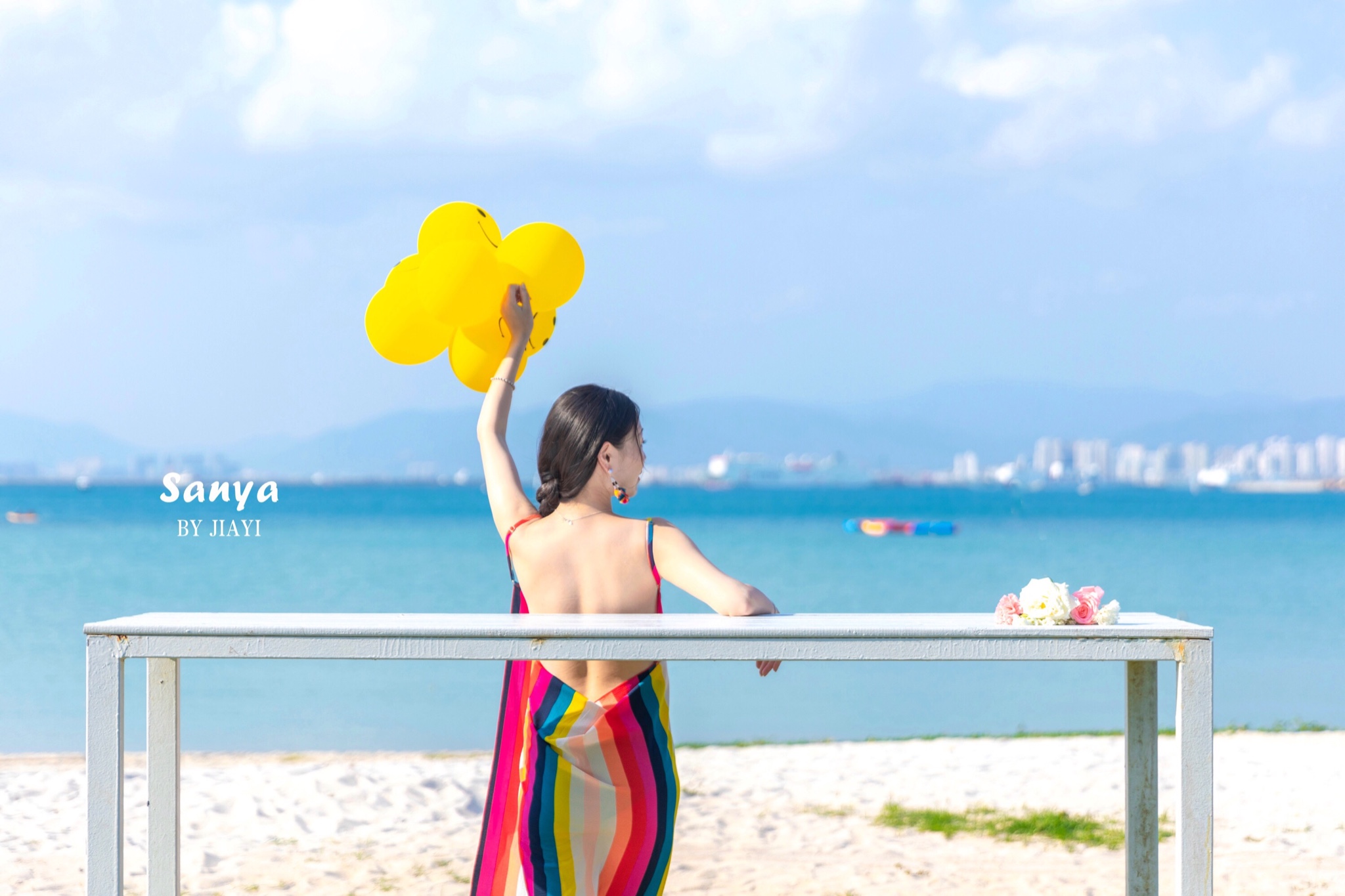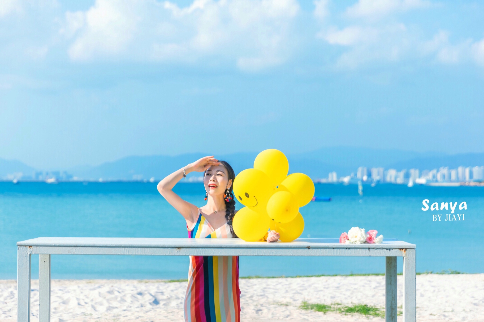 带了黄色的气球来当道具,海滩可以拍到凤凰岛当背景的海,角度还是很美的。的确,这里有很多拍婚纱的机构,沙滩上好多对情侣在拍照。