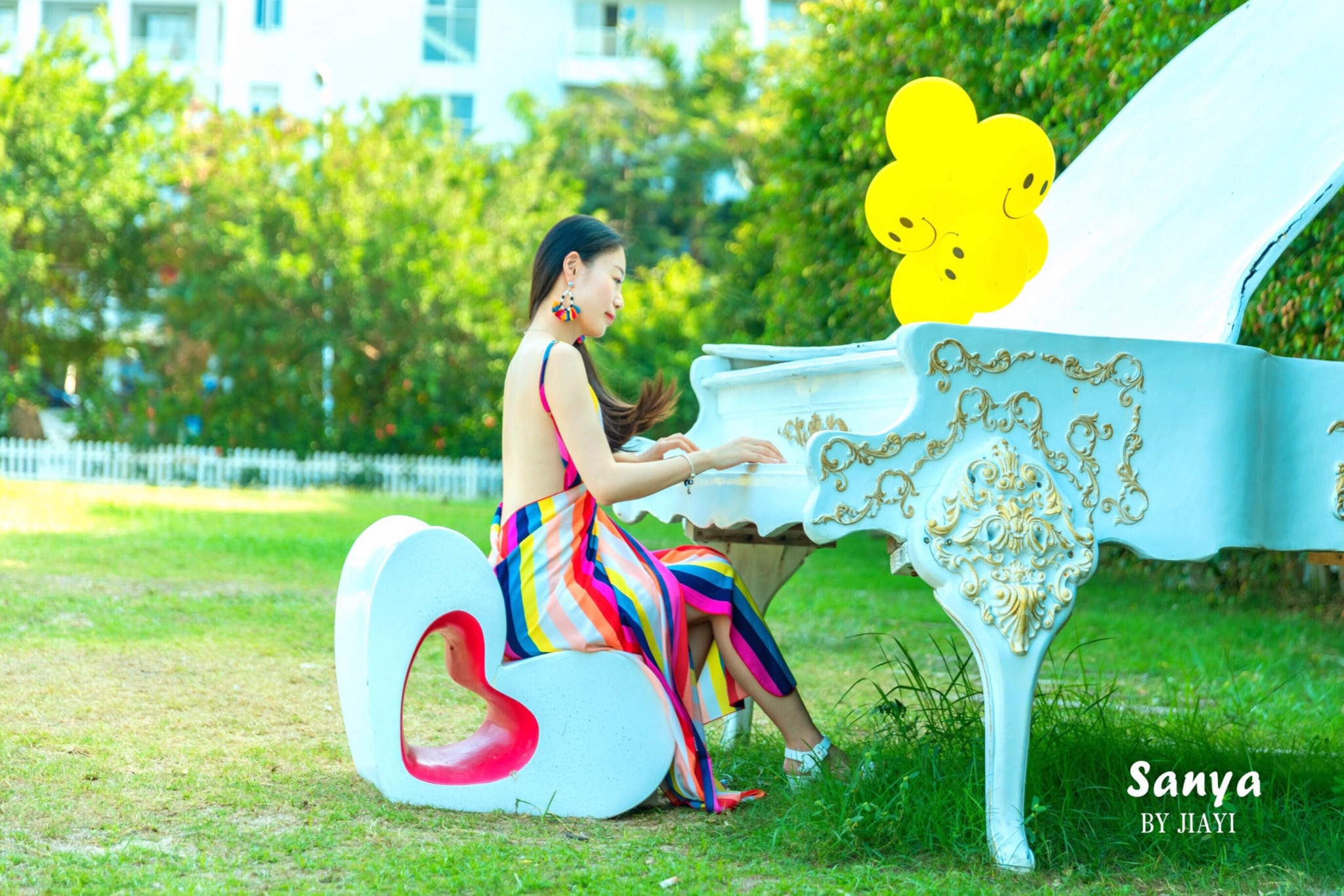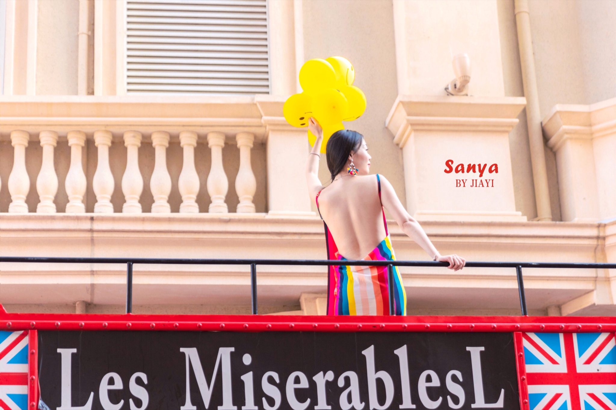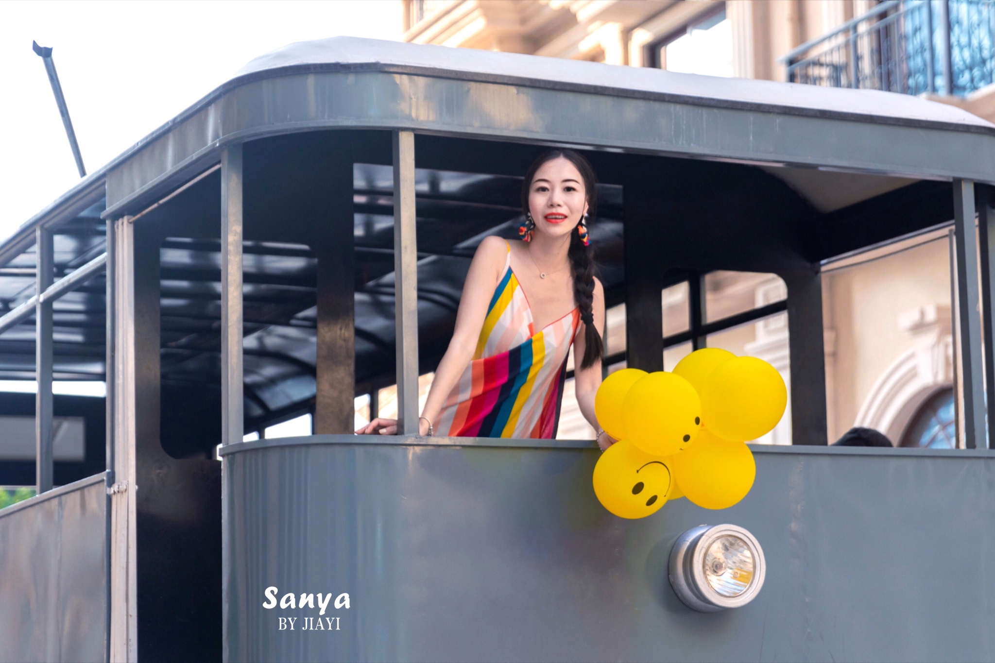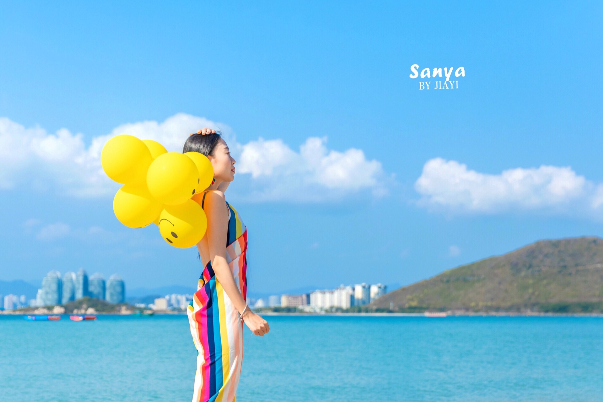 带了黄色的气球来当道具,海滩可以拍到凤凰岛当背景的海,角度还是很美的。的确,这里有很多拍婚纱的机构,沙滩上好多对情侣在拍照。