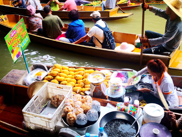 丹嫩沙多水上市场位于湄南河的支流上,整个市场由纵横交错的卖货小船和两岸泰式吊脚楼式的居民屋构成,售卖的商品包括热带水果、小吃、手工艺品等。看中什么只需向对方船家挥手或者让船夫停靠沿岸商铺即可,全程悠闲、新奇,充满乐趣。