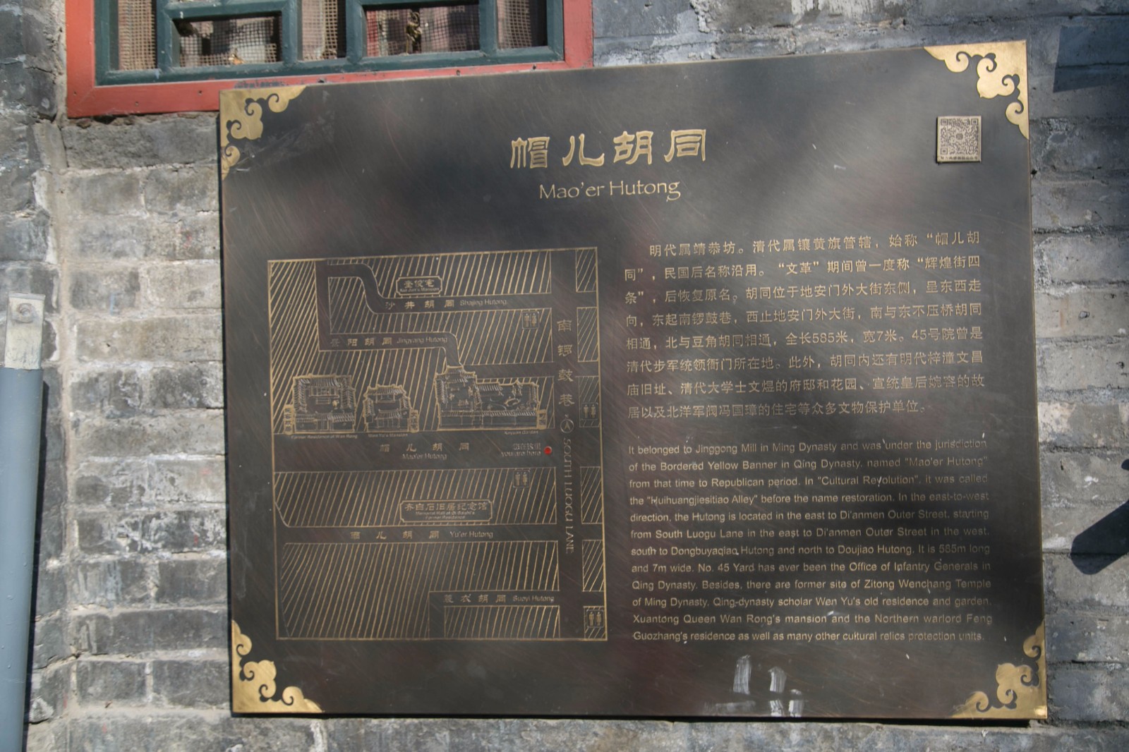 帽儿胡同,位于北京老城区鼓楼和地安门之间,东城区交道口地区,东连南锣鼓巷,西接北京的龙脉地安门中轴线,是北京幸存的25片胡同保护区中的一条非常著名的胡同,是当今北京城十大胡同之一,排行第四。