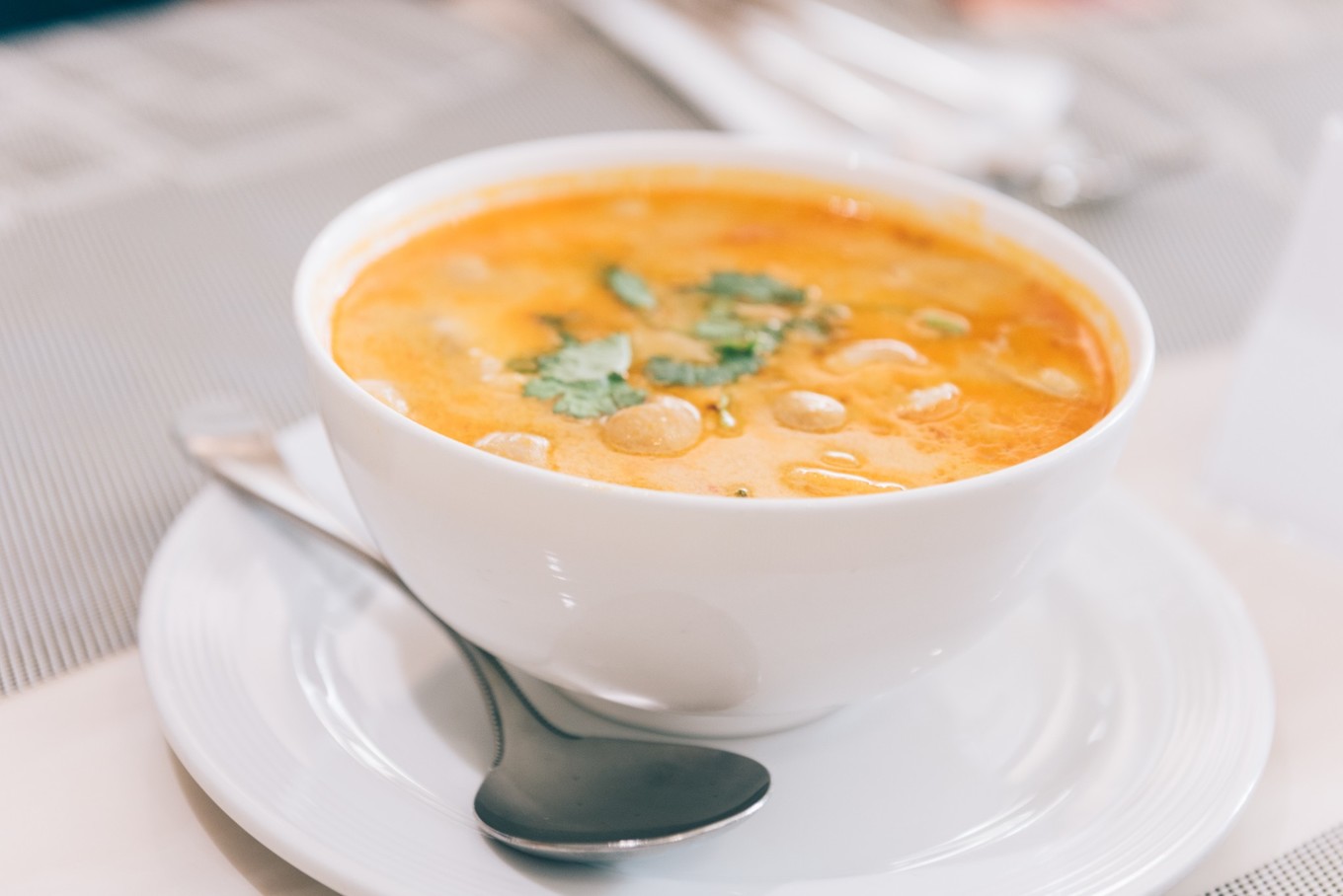 冬阴功汤是最著名的泰国菜之一,直译过来就是酸辣虾汤,汤的材料包括甘草、柠檬、冬葱、胡椒、鱼露等,细尝时,一股奇香怪辣味冲上脑门,再三品尝,原来酸辣之外还有点海鲜的甜味,透着一丝鲜香。